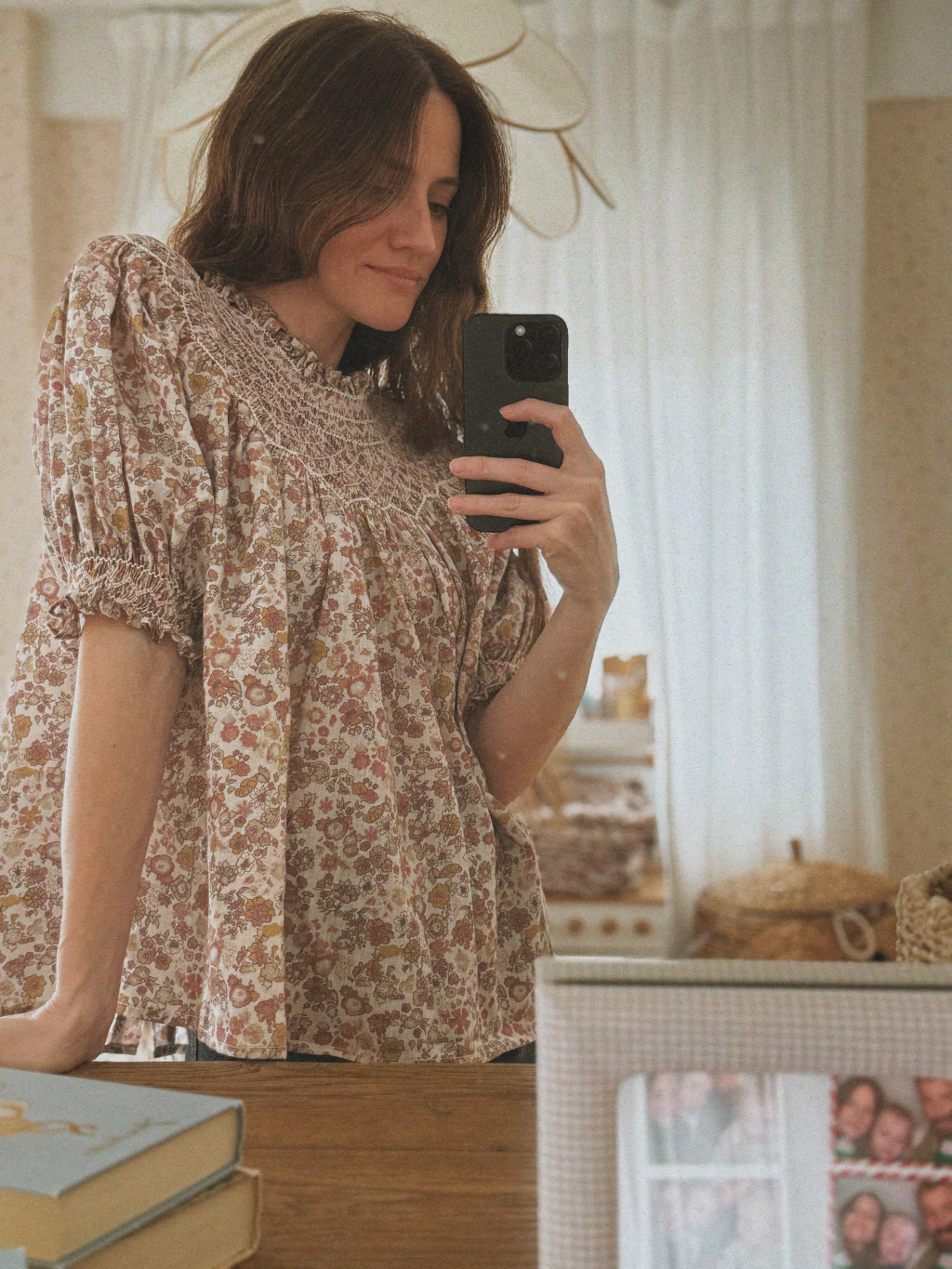Nuestra blusa está confeccionada con mucha dedicación, cuenta con carpeta de botones en su parte trasera, bordada en punto smock con la técnica de fruncido, su cuello cuenta con terminación con volado, dándole ese aire romántico & vintage que caracteriza las prendas de Sunflorakids.